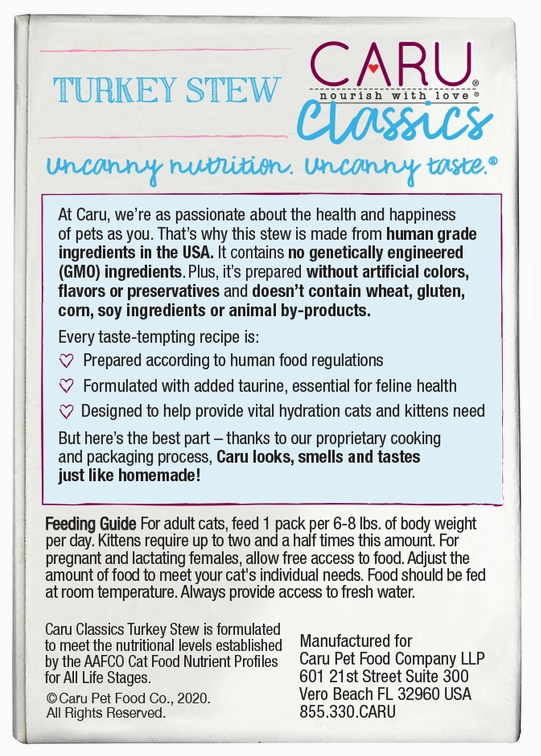 A natural, complete and balanced, wet adult maintenance food with added vitamins, minerals and taurine. This healthy, highly nourishing stew is made with 100% human grade ingredients in a human food plant in the USA. Each slow cooked batch is made with real protein plus orchard apples, pumpkin and garden veggies. These limited ingredient recipes are prepared without GMO ingredients, animal by-products, artificial colors, flavors, preservatives or gums. So, you can offer your pet a stew that looks, smells and tastes like you made it at home.